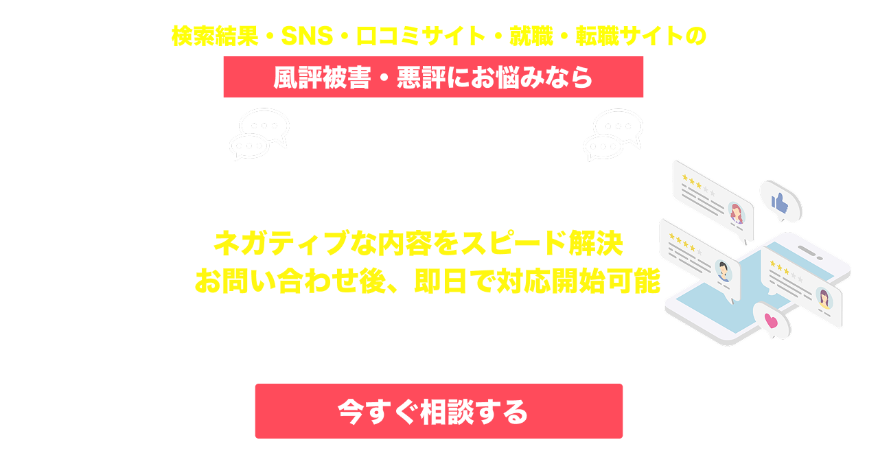 「口コミ評価アップサービス」なら、マイナビ、リクナビ、学生情報などへのネガティブな書き込み、炎上などの悪質な誹謗中傷・風評被害を早期に解決。